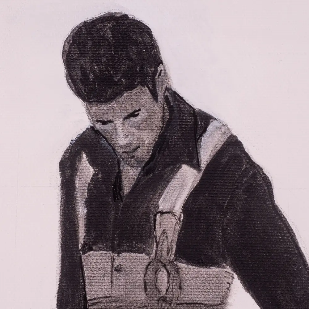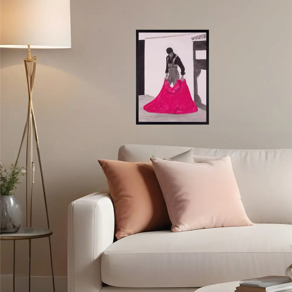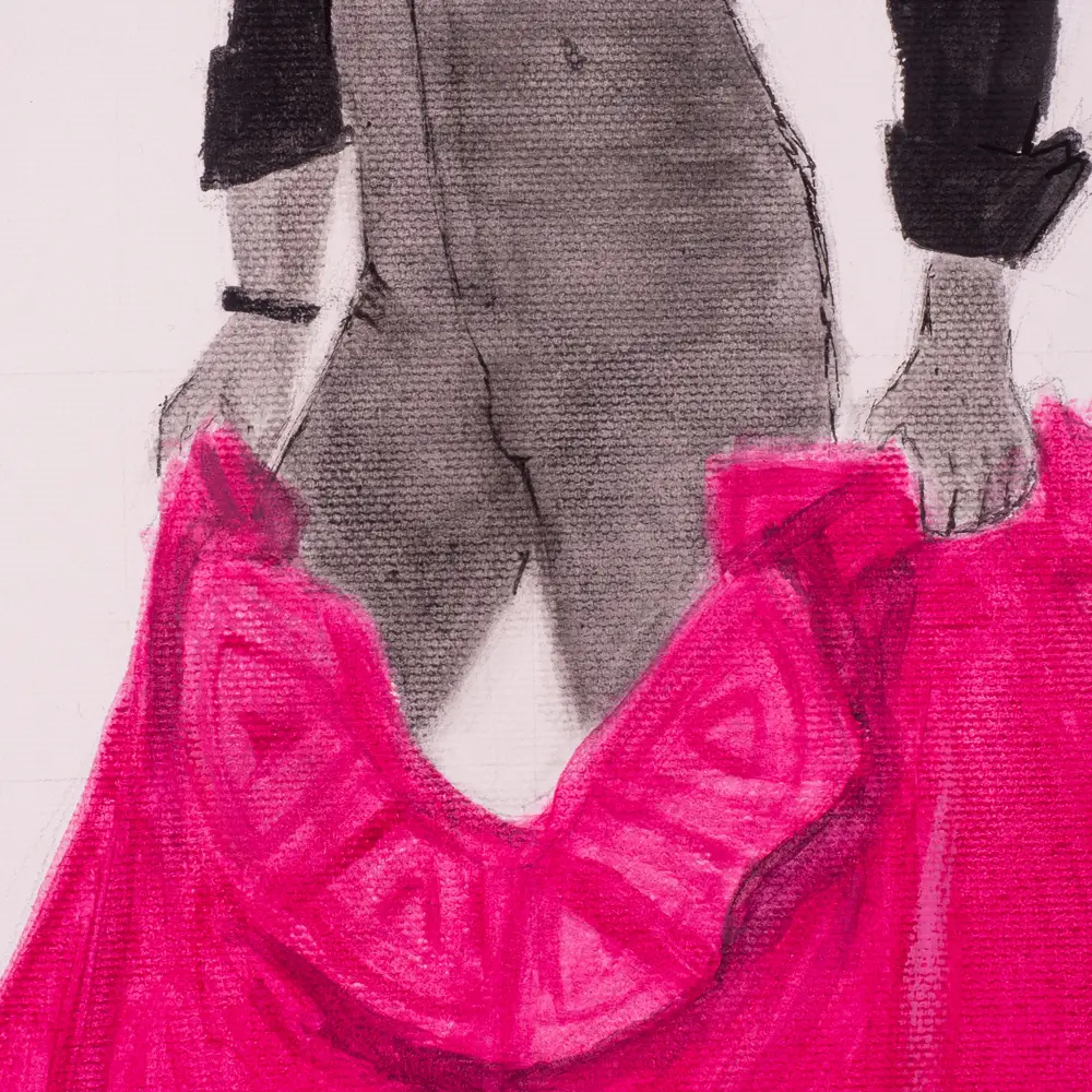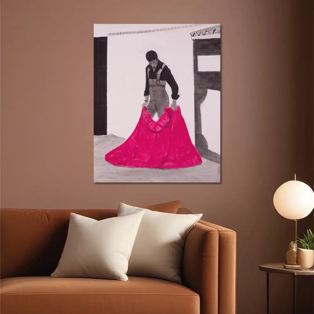 Esta obra fue inspirada por una fotografía que realicé en un tentadero a mi gran amigo y compadre «El Platero», novillero destacado cordobés de los años 90, y encargo de un amigo común, Pablo.