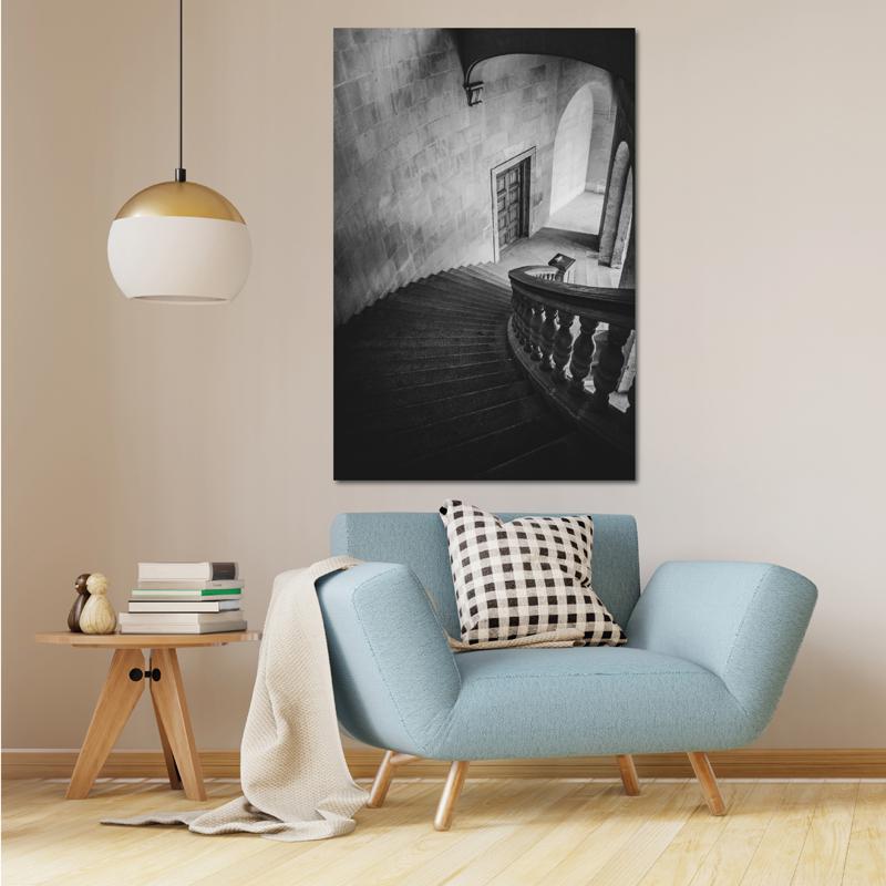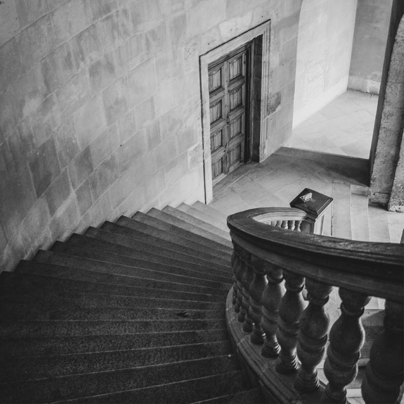 Obra fotográfica llamada Escaleras, muestra una imagen en banco y negro de una bajada de escaleras en el Palacio de Carlos V en Granada. Que podrás adquirir reproducciones de la misma en diferentes materiales y formatos. Todas las reproducciones son numeradas con un máximo de 15, entregadas con certificado de autenticidad y firmadas a mano.