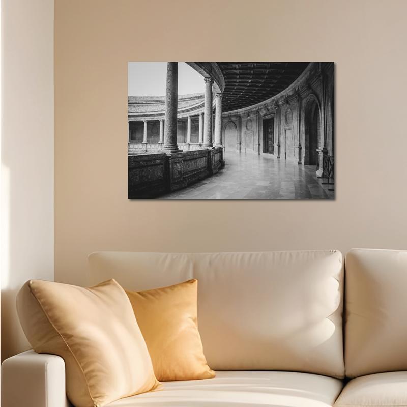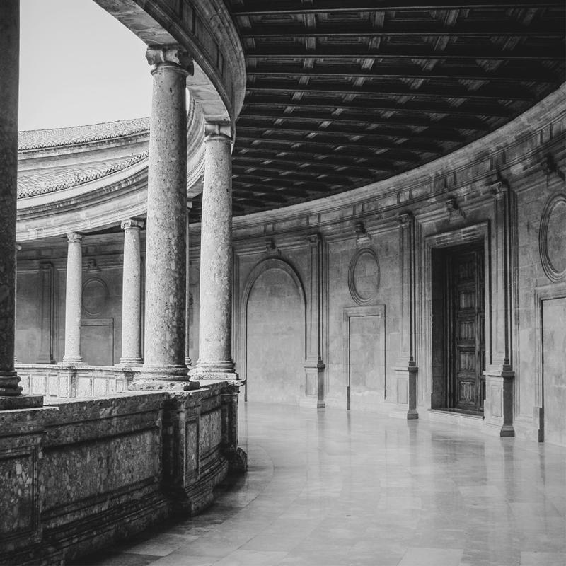 Obra fotográfica llamada Palacio Imperial, muestra una imagen en blanco y negro del interior de Palacio de Carlos V que está en la Alambra de Granada. Que podrás adquirir reproducciones de la misma en diferentes materiales y formatos. Todas las reproducciones son numeradas con un máximo de 15, entregadas con certificado de autenticidad y firmadas a mano.