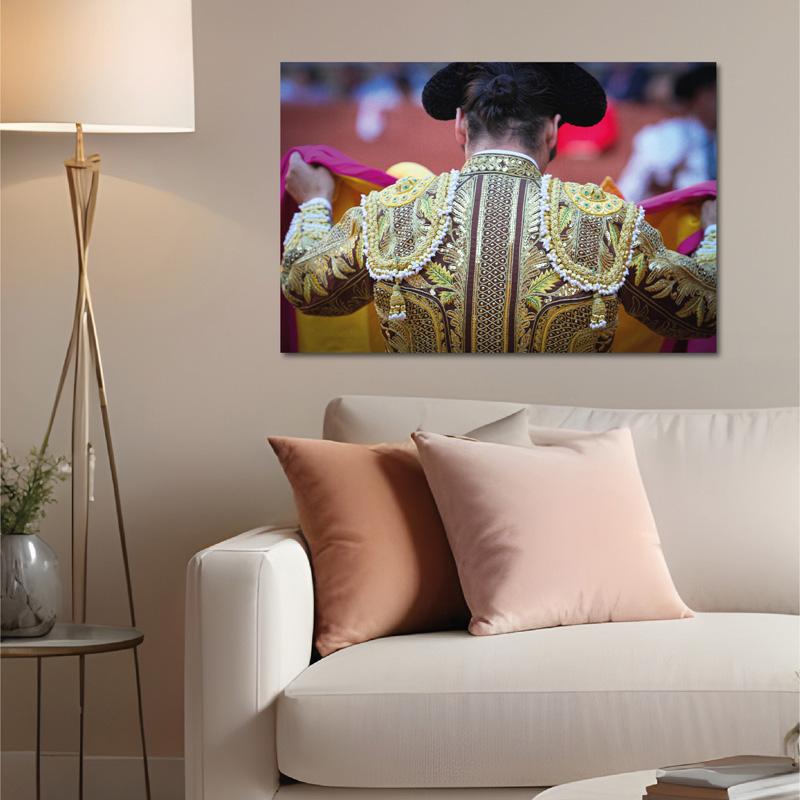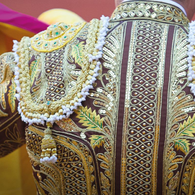 Obra fotográfica llamada Tabaco y Oro, muestra una imagen de un torero de espaldas sosteniendo un capote con un traje que da nombre a la obra. Que podrás adquirir reproducciones de la misma en diferentes materiales y formatos. Todas las reproducciones son numeradas con un máximo de 15, entregadas con certificado de autenticidad y firmadas a mano.